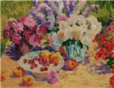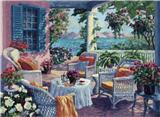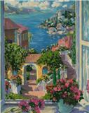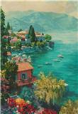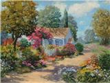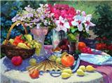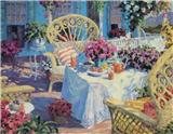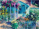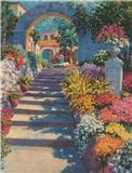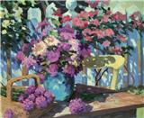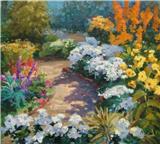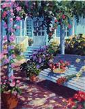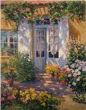 But in the last few years has concentrated solely on producing paintings. His subject matter has primarily centred on gardens, with the introduction, of pathways, views looking out from windows, still life, but always with a floral or natural element. He manages to capture the magic of the sun drenched parts of the world with bold use of colour.
