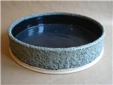 The volcanic glaze is overloaded with silicone carbide, fired to cone nine and crash cooled to fix the surface texture. Inside a smooth black glaze is applied to make using and cleaning more practical.