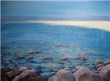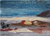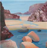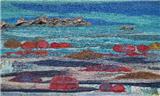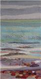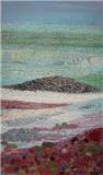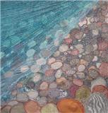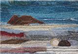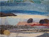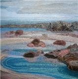 Most of her work reflects her love of the natural world. In recent years her textile work has developed mainly along two different stylistic routes. The first of these are seascapes and landscapes which owe much to her painting background. The second is a series of work which has developed from pictures made over several years using her own handmade paper as a background. The size became restrictive so she developed a unique way of producing a similar effect on a much larger scale using textiles and acrylic paint. These pieces are more abstract. She has constructed large scale commissions using this technique for The Atlantic Hotel, Jersey and Basel Trust International.